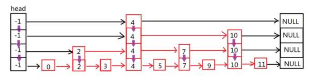 假如我们要查询11,那么我们从最上层出发,发现下一个是5,再下一个是13,已经大于11,所以进入下一层,下一层的一个是9,查找下一个,下一个又是13,再次进入下一层。最终找到11。